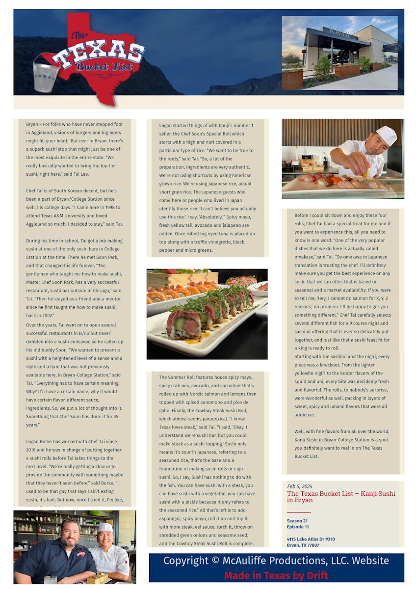 CHECK WITH OUR CHEFS FOR A WEEKLY FEATURED SUSHI ROLL OR SEE IF CHEFS ARE FEELING INSPIRED TO CREATE SOMETHING COMPLETELY DIFFERENT.